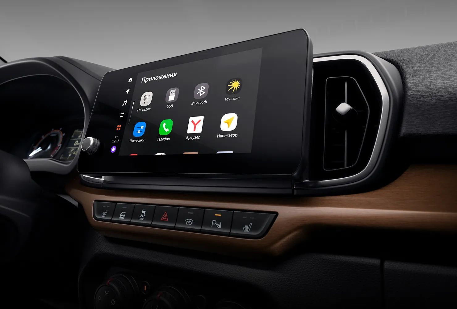 - Мультимедийная система LADA EnjoY Evo (8'' TFT-IPS ёмкостный дисплей, FM, 2USB, Bluetooth, Hands Free со сдвоенным микрофоном и функцией шумоподавления, интегрированная платформа Яндекс Авто с виртуальным ассистентом Алиса с функциями голосового управления ММС и Яндекс Навигатором), 4 динамика